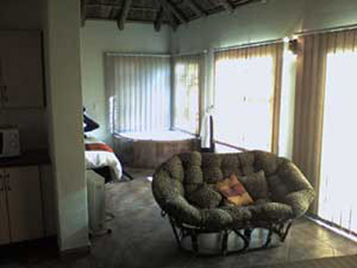 The chalets are fully equipped for self catering and include microwave, hot plate stove, fridge, fireplace and private patio braai. There are 8 chalets approximately 50 metres apart, ensuring privacy. Each chalet has an open plan layout accommodating two adults, a queen size bed and corner bay window bath overlooking the river.